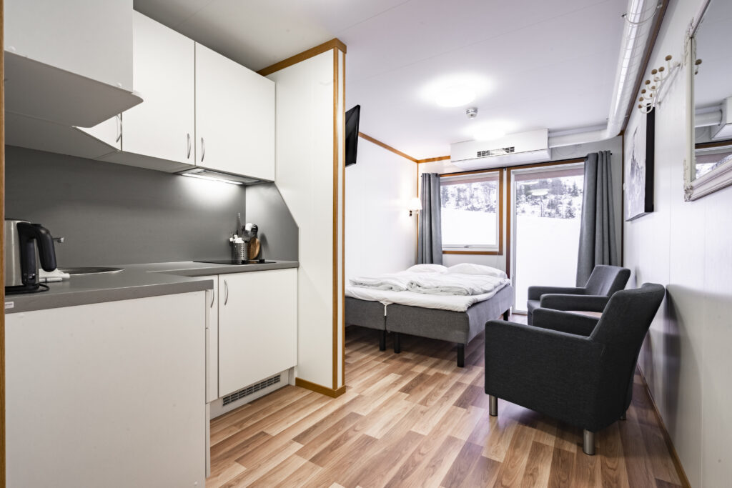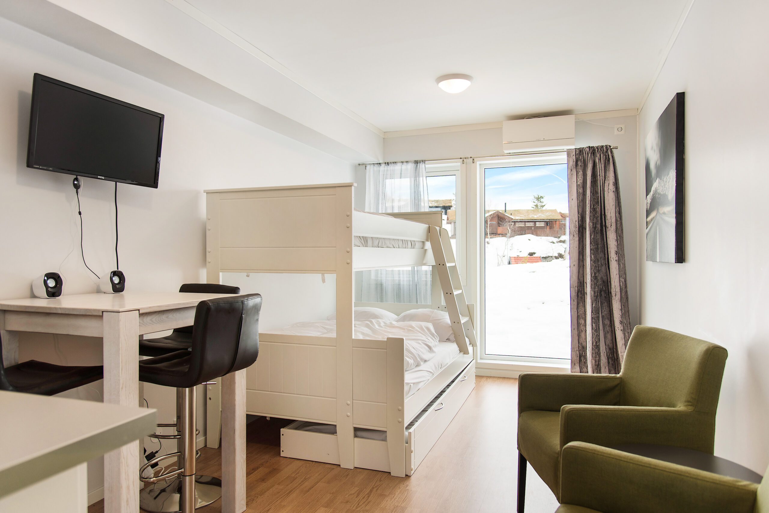 Family room – Our family rooms are perfect for up to two adults and two small children. The room has a comfortable double bed with a single bed above, as well as a pull-out bed in a bottom drawer – ideal for the little ones. Handy with a small kitchenette containing a fridge, microwave, 2-plate hob, kettle, dishcloth, zalo and everything you need for cooking. Located right in the heart of our family area, Hulderheimen. All families also have bed linen, towels and toilet paper. There are no hairdryers, shower gel or shampoo included.