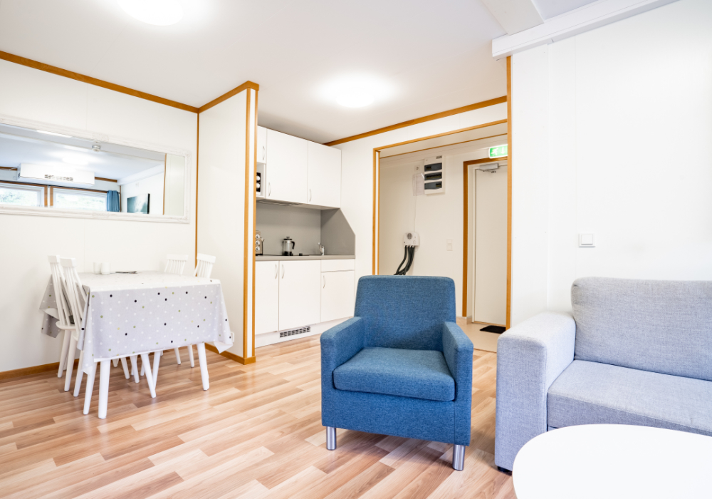 2-bedroom apartment – Our 2-bedroom apartment is perfect for up to four adults and two small children. The apartment has a comfortable double room, another room with a bunk bed and the option of a sofa bed. Convenient with a small kitchenette that includes a fridge, microwave, 2-plate stove, kettle, cloth, washing-up liquid and everything you need for cooking. Located right in the heart of our family area, Hulderheimen. The apartment also includes bed linen, towels and toilet paper. Hairdryer, shower gel or shampoo are not included.